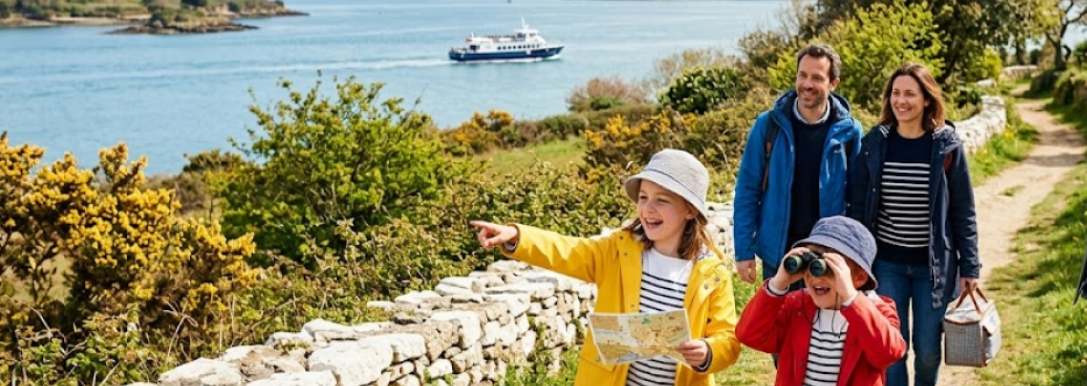 Ils peuvent observer les flots, chercher les balises rouges et vertes qui guident les navires, et sentir les premiers embruns du printemps. La traversée est courte, environ cinq minutes depuis Port-Blanc. C'est un timing parfait pour capter leur attention sans qu'ils aient le temps de s'impatienter avant de poser le pied à terre.